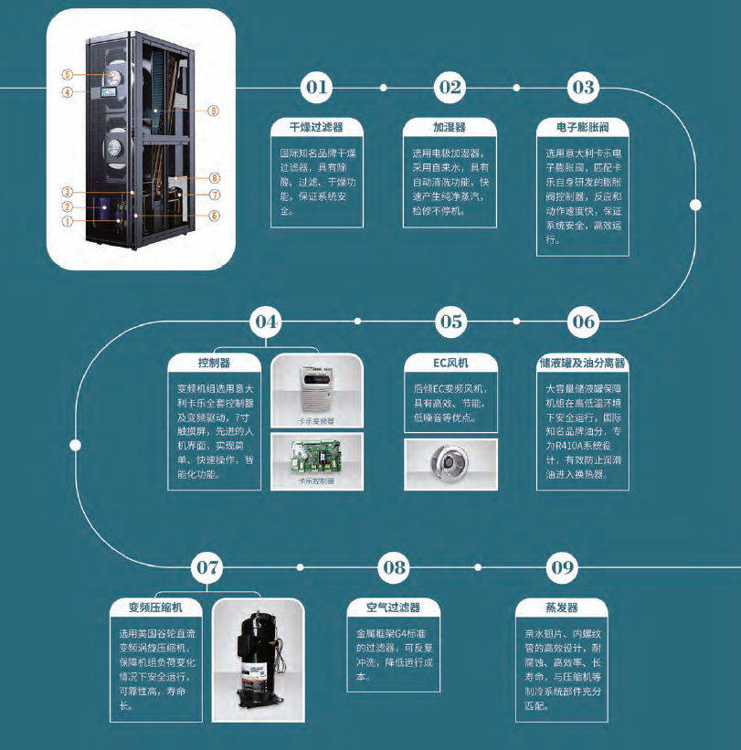 機(jī)組可配置多組溫度傳感器,可實(shí)時(shí)檢測(cè)空調(diào)或服務(wù)器機(jī)柜不同位置的溫度,確保最佳的制冷效果;